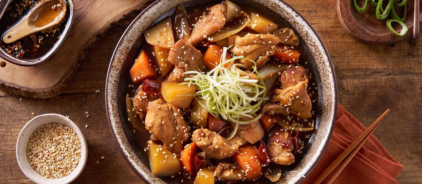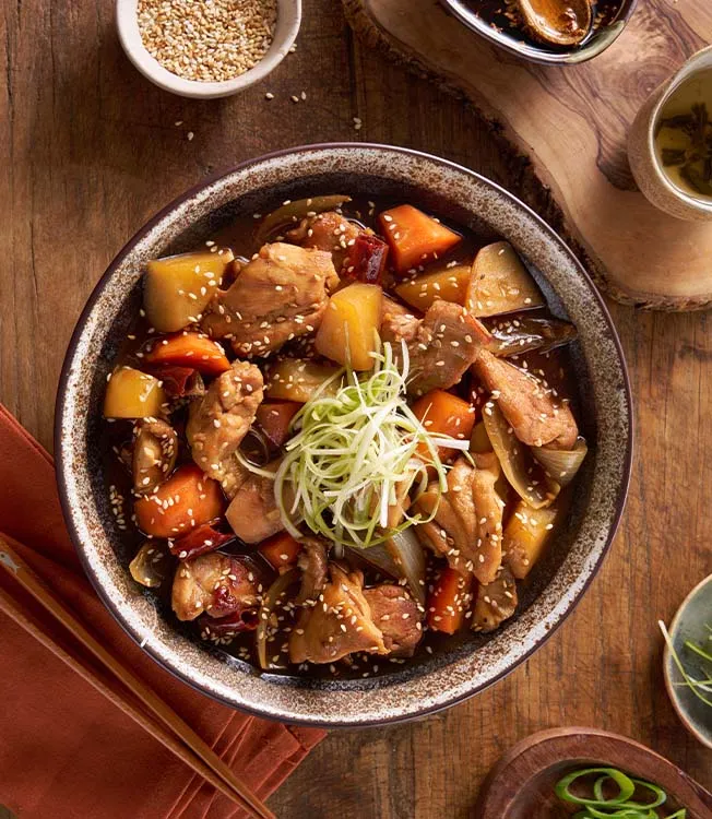 Möra kycklinglår bräserade med grönsaker i Kikkoman sojasås och toppade med Kikkoman sesamolja. En tjock, glansig sås och en krispig topping av sesamfrön och salladslök ger den en distinkt koreansk smak.