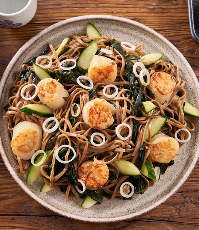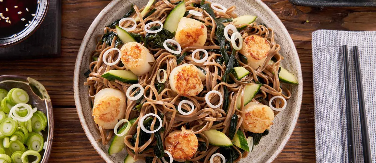 Saftiga, gyllene grillade pilgrimsmusslor serverade på sobanudlar med krispig gurka och wakame-alger. En lätt och elegant fusionsrätt kryddad med Kikkoman Pokesås.