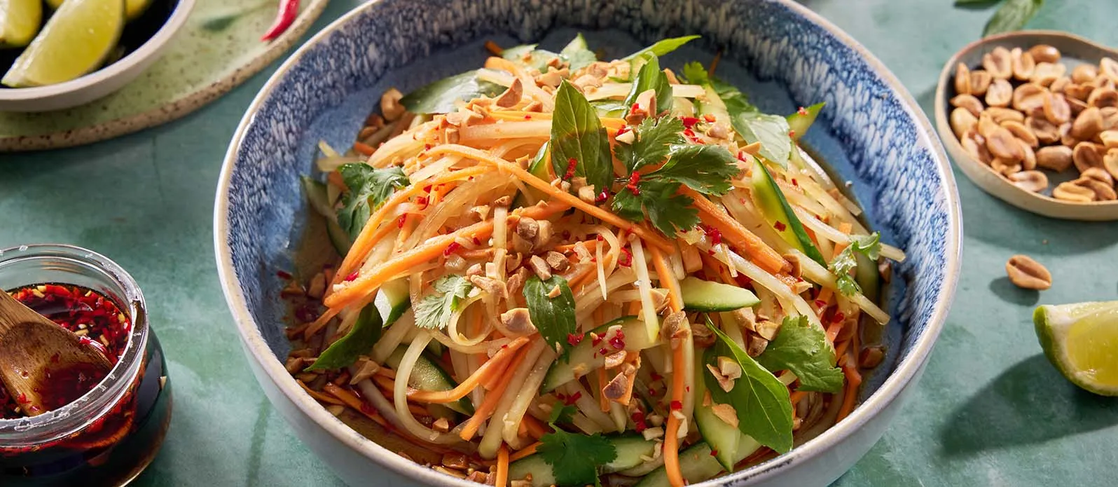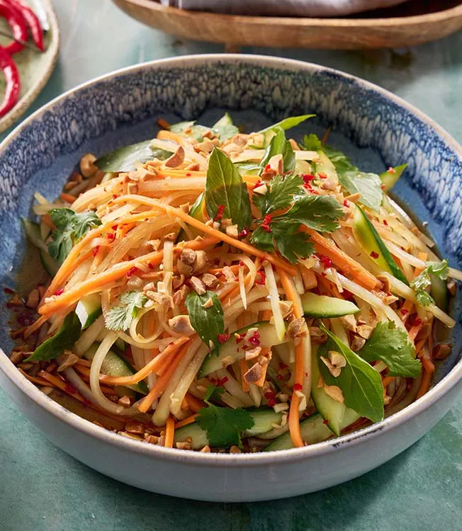En lätt, uppfriskande grön papayasallad i thailändsk stil med en doftande dressing gjord på Kikkoman Ponzu-citron och palmsocker, toppad med krispiga jordnötter, koriander och basilika för en krispig aromatisk avslutning.