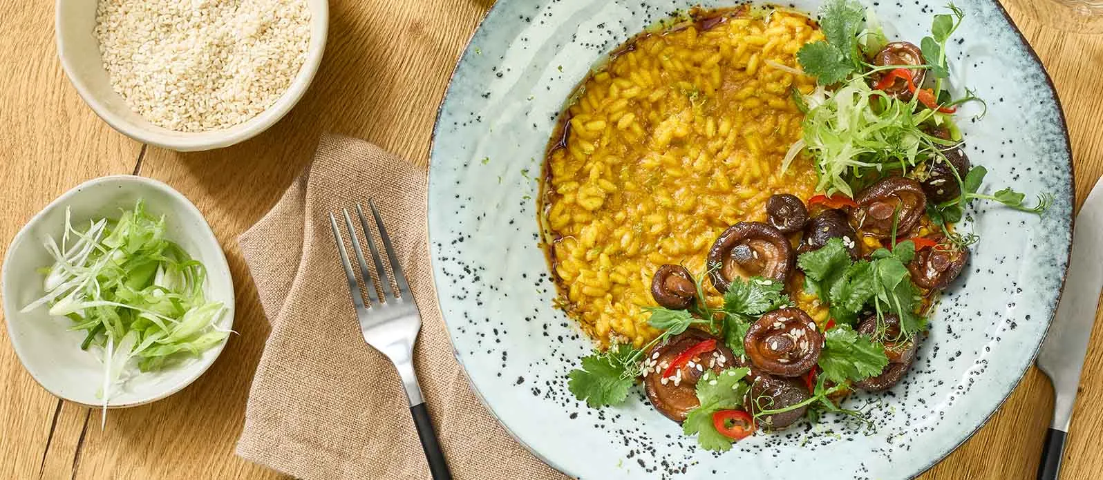 Denna krämiga kokosmjölksrisotto får sin karaktäristiska "gyllene mjölk"-arom från gurkmeja, ingefära och kanel. Shiitakesvampar och chili avrundar smaken. Kikkomans glutenfria sojasås ger djup och håller rätten fri från gluten.