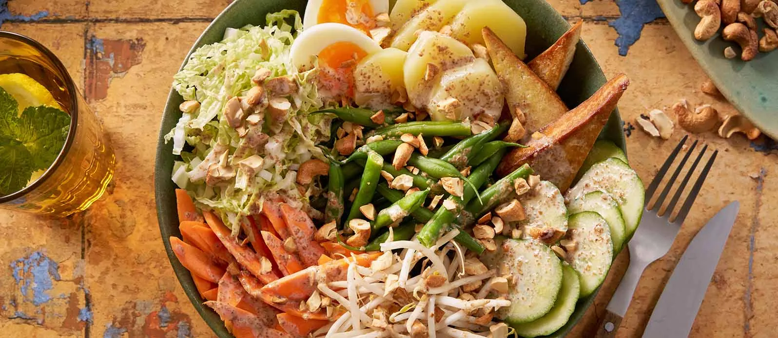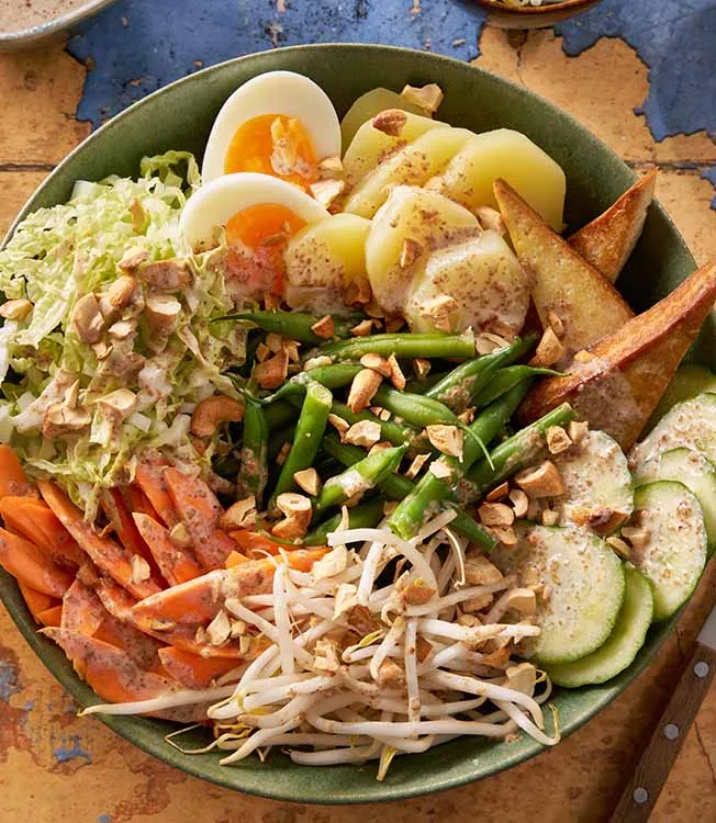 Gado-gado-sallad från Indonesien, med aromatisk Kikkoman sesamsås ringlad över. Samt nötter som ger krispighet och distinkt karaktär.