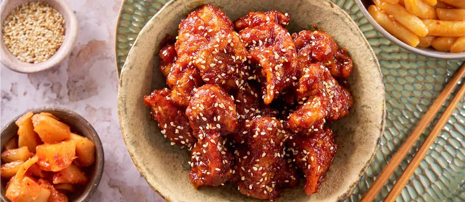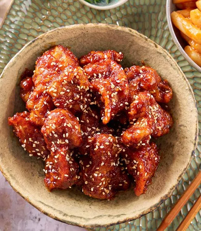 Saftig kyckling, dubbelfriterad för exceptionell krispighet och täckt med en söt-kryddig Kikkoman Kimchi chilisås med honung och vitlök – autentisk koreansk gatumat när den är som bäst.