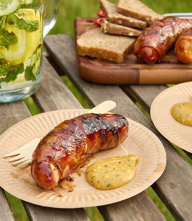 Täck korvarna med Kikkoman Teriyaki BBQ-sås med honung och tillaga sedan på varje sida på en het grill tills baconet och korvarna är gyllenbruna. Servera med teriyakisenapen.