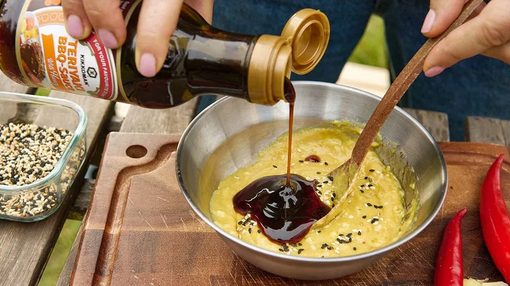 4 msk senap – 2 msk Kikkoman Teriyaki BBQ-Sås med honung & röksmak – ½ tsk honung – 1 tsk riven ingefära – 1 msk rostade sesamfrön – 1 tsk Kikkoman rostad sesamolja