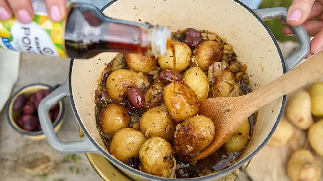 300 g småpotatis – 2 msk olja – 1 lök, finhackad – 2 vitlöksklyftor, hackade – 70 g kalamataoliver, urkärnade och halverade – 350 ml grönsaksbuljong – 3 färska timjankvistar – 1 tsk torkad oregano – 4 msk Kikkoman Ponzu - en Blandning av Sojasås, ättika och citron – 4 msk Kikkoman Teriyaki marinad