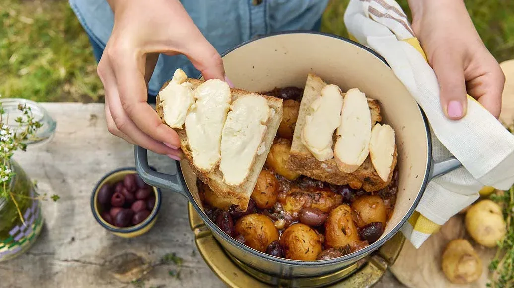 Under de sista 2 minuterna av tillagningen lägger du till brödskivorna i pannan och täcker med racletteosten. Låt osten smälta i 3–4 minuter och servera sedan.