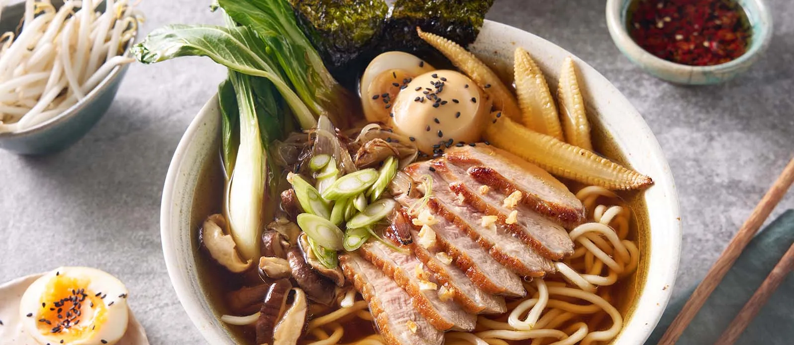 Aromatisk shoyu ramen med möra ankskivor i en rik, smakrik buljong smaksatt med ingefära, vitlök och Kikkoman sojasås. Denna läckra och mättande rätt erbjuder lager av värme och djup umami-rikedom.