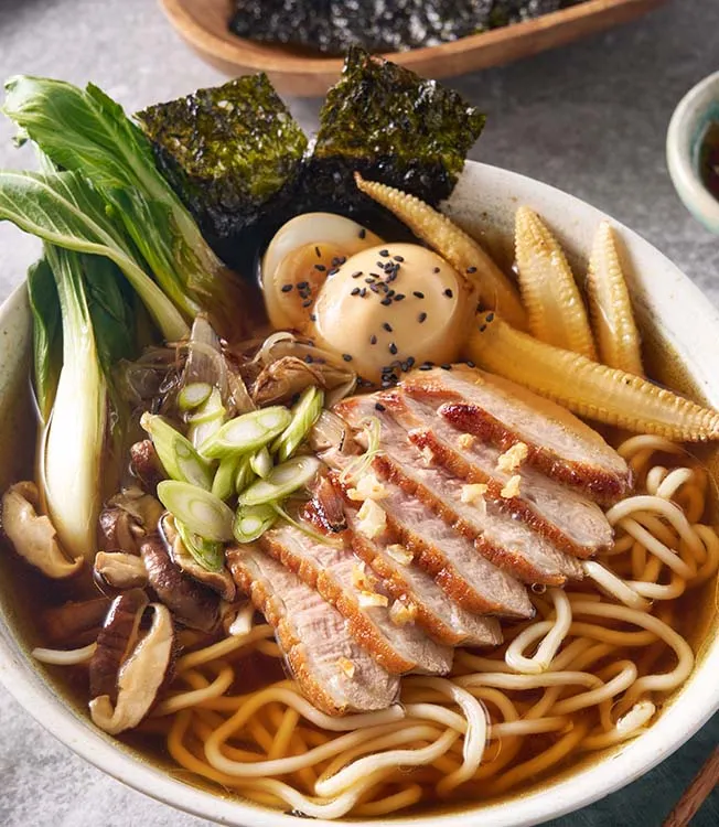 Värm rapsoljan i en stekpanna och stek shiitakesvampar, pak choy och babymajs i 3–4 minuter och vänd då och då. Lägg ramennudlarna i skålar. Tillsätt 2–3 msk shoyutara och Kikkoman sesamolja. Häll över en del av den varma buljongen. Tillsätt grönsakerna, lägg ankskivorna ovanpå och avsluta med det marinerade ägget. Servera garnerat med salladslök och nori.