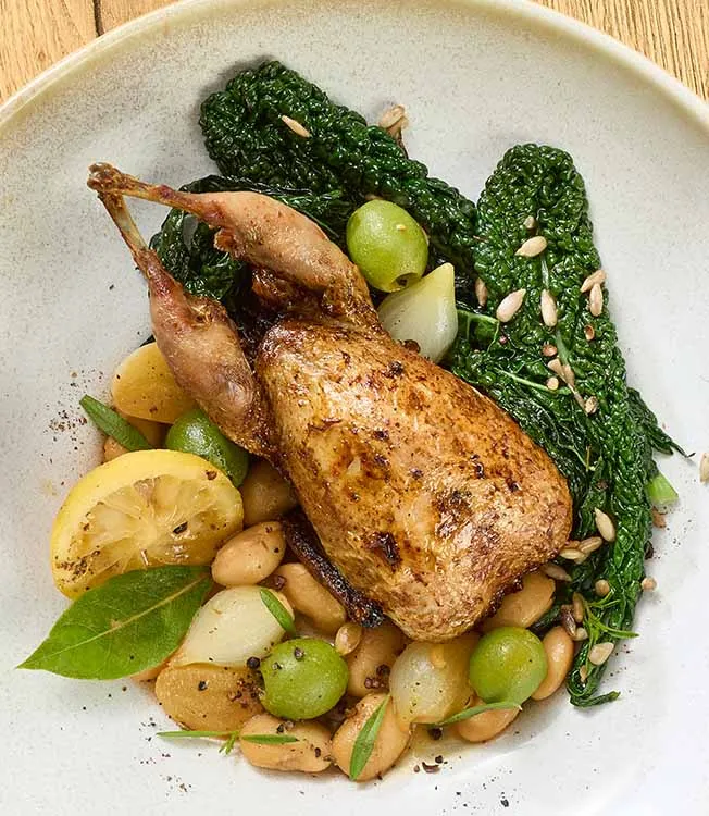 Vaktel med svartkål och bondbönor