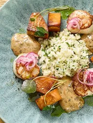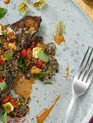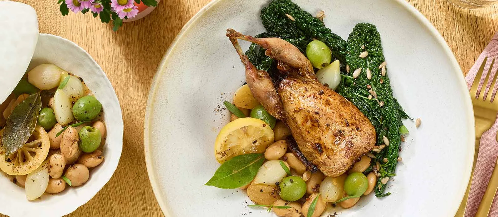Ugnsstekt vaktel serverad med en aromatisk blandning av citron, svartkål, bondbönor och oliver. Marinerat i Kikkomans ekologiska sojasås håller köttet sig extra mört och smakerna är perfekt balanserade.