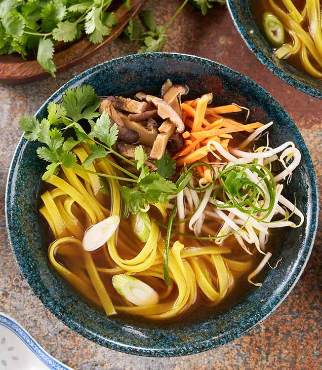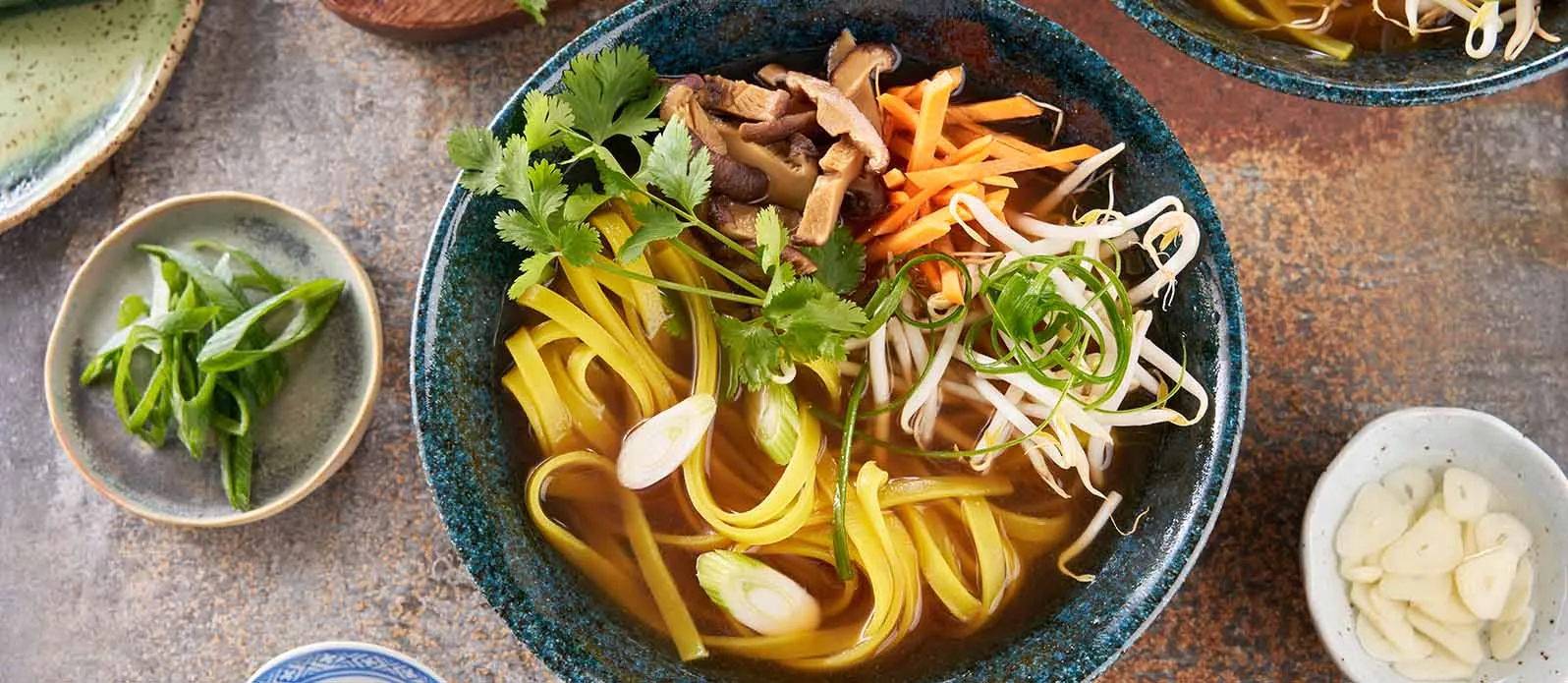 Aromatisk vegetarisk pho med tofu, shiitakesvamp och färska grönsaker i en buljong med doft av stjärnanis, kardemumma och ingefära. Lätt, hälsosam och full av umami med Kikkomans glutenfria sojasås.