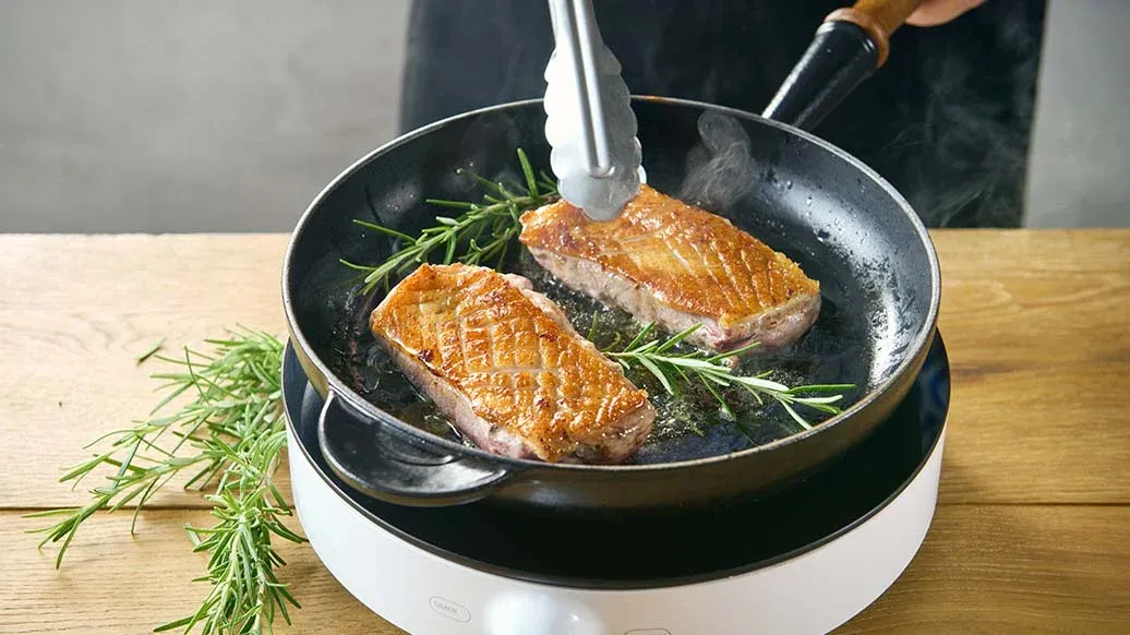 En gourmetmåltid hemma – saftigt ankbröst serveras med en söt björnbärssås och krispig rostad potatis med ett inslag av miso.