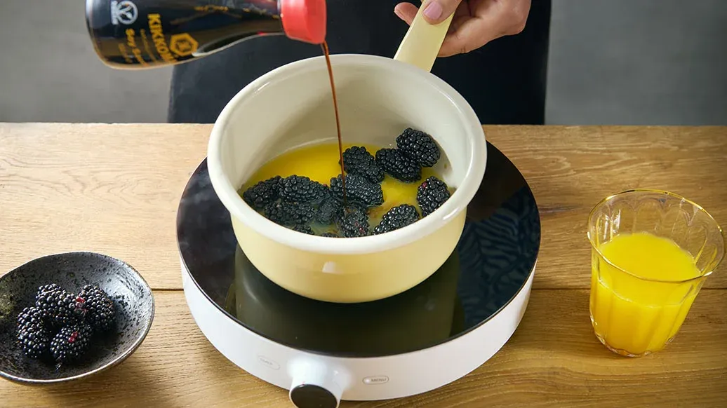 120 g björnbär – 100 ml apelsinjuice – 30 g honung – 30 ml Kikkoman naturligt bryggd sojasås – 30 ml äppelcidervinäger