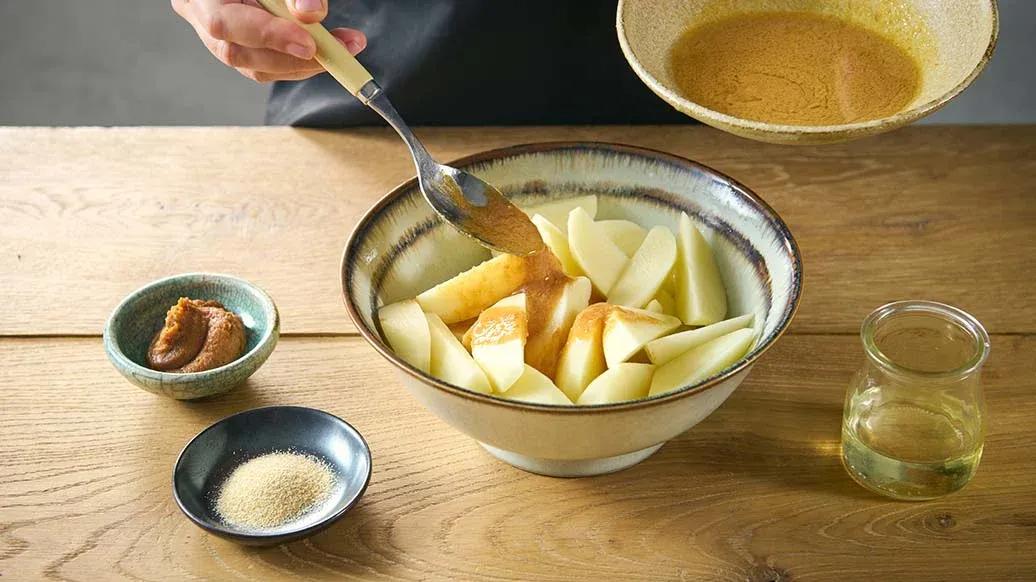 Skär potatisen i klyftor och blanda med misopasta, vitlöksgranulat/ vitlökspulver och olja. Grädda i 180°C i ca. 40 minuter.