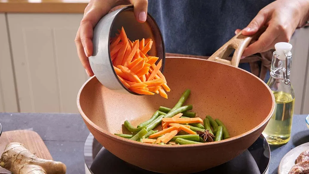 Värm oljan i samma wok, tillsätt ingefära, morot, gröna bönor och stjärnanis och stek under omrörning i 2-3 minuter. Tillsätt vattnet och låt det koka i cirka 2 minuter tills bönorna mjuknar.