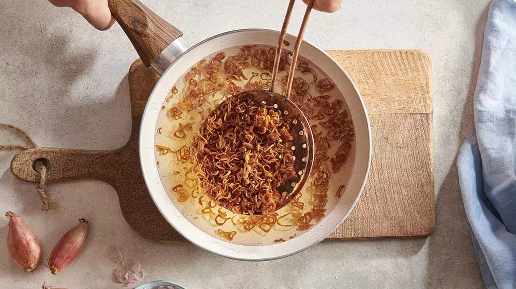 Skiva schalottenlöken jämnt och lägg på hushållspapper. Strö över två nypor salt och låt vila i 10-15 minuter så att saltet tar ut fukten ur löken. Värm oljan i en gryta eller wokpanna för stekning. Lägg schalottenlöken i oljan och stek tills den är gyllenbrun. Ta sedan bort från oljan, låt rinna av på ett torrt hushållspapper och strö över salt.