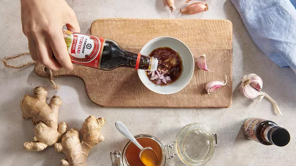 2 msk Kikkoman Teriyaki marinad – 1 msk risvinäger – 1 msk honung – ¼ tsk Kikkoman rostad sesamolja – ½ schalottenlök – ½ tsk mald vitlökspasta – 1 tsk inlagd ingefära