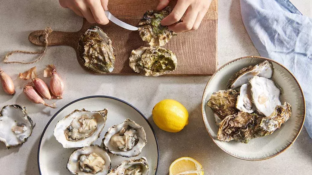 Servera ostronen med 1 eller 2 tsk dressing och ett stänk knaprig schalottenlök.