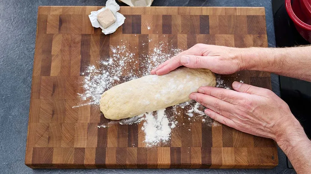 Cut the bread into cubes. Mix the flour, salt, milk, crumbled yeast, sugar and egg yolk into a smooth dough. Fold in the bread cubes, cover and leave to rise in a warm place for about 1 hour. Shape the dough into a long roll and steam over hot water or in a steamer insert for about 20 minutes.