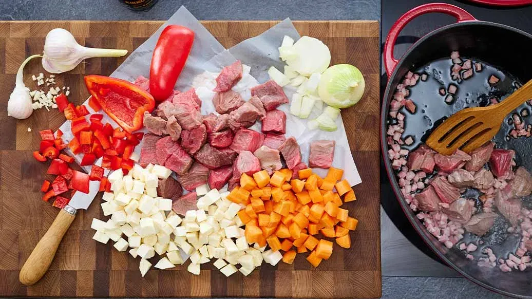 Heat the oil in a casserole or heavy-based pan and brown the venison and bacon for 8 to 10 minutes. Dice the pepper, carrots, parsnips and onions, finely chop the garlic and add to the pan. Fry for about 8 minutes, stirring occasionally.