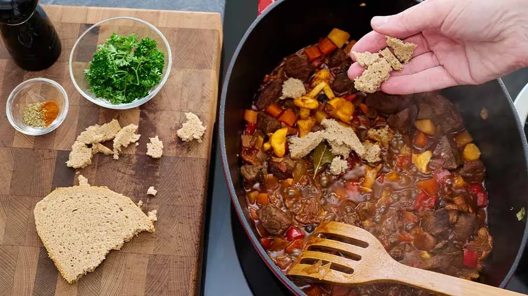 Trim the crusts from the bread and tear the bread into small pieces. Use it to thicken the goulash, then season with the pepper, chilli powder and marjoram. Wash and dry the parsley, then pick off the leaves. Slice the dumpling roll, arrange on plates with the goulash, garnish with the parsley and serve.