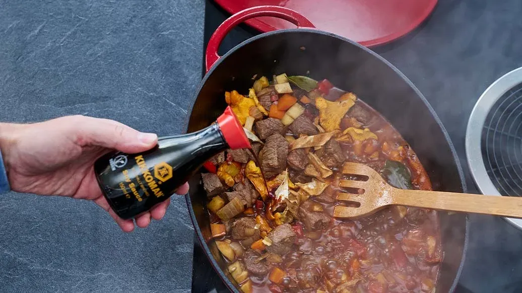 A celebratory stew of mushrooms, root vegetables and dried fruit, deepened with red wine and Kikkoman Soy Sauce. Served with dumplings, this rich, sweet and savoury goulash makes a perfect winter feast.