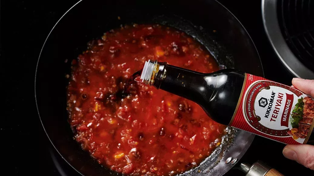 Finhacka tomater, chili, lök och vitlök och fräs i den uppvärmda oljan. Strö över sockret och karamellisera lätt. Tillsätt Kikkoman teriyaki-marinad och sjud salsan utan lock i 5-10 minuter. Krydda salsan med spiskummin och rökt paprikapulver.