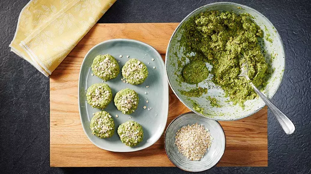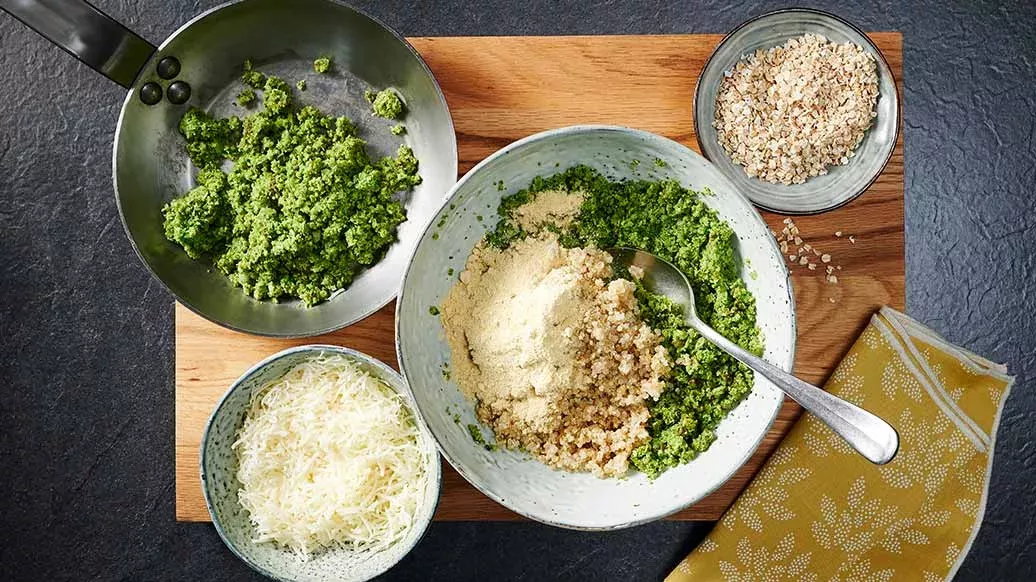 För broccolifritters; koka quinoan enligt anvisningarna på förpackningen. Använd en matberedare och hacka broccolin fint. Finhacka schalottenlök och vitlök. Stek broccolin i 1 msk uppvärmd olja, tillsätt schalottenlök och vitlök, fräs allt i ca 15 minuter och lägg sedan över i en skål. Blanda i quinoan, kikärtsmjölet, 30 g havreflingor och osten och låt svalna lite.