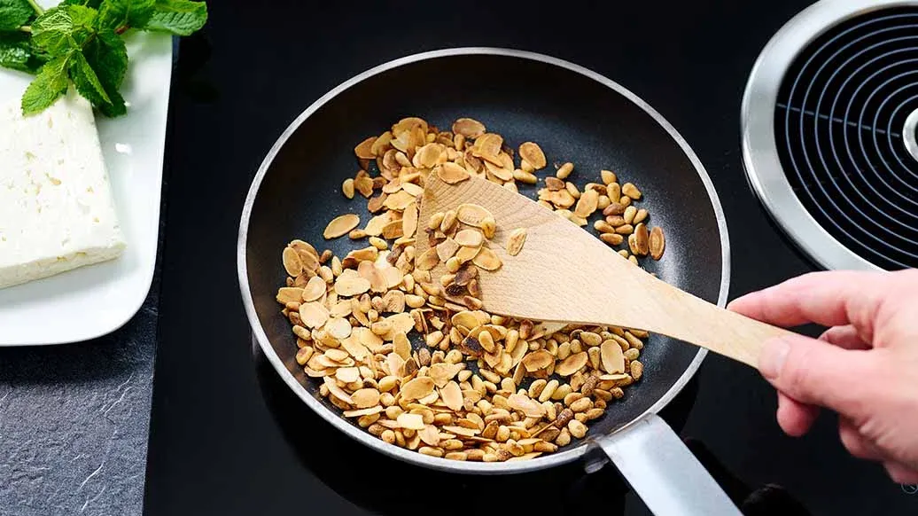 Rosta mandelflarnen och pinjenötterna i en liten stekpanna med non-stick-beläggning i cirka 3 minuter tills de är gyllenbruna. Smula fetaosten.