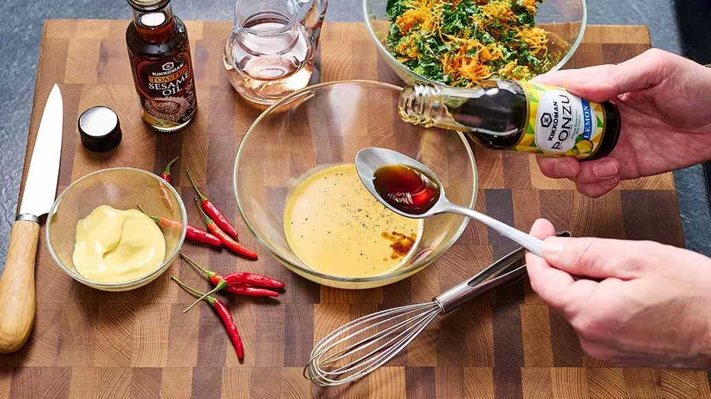 För att göra dressingen, finhacka chilin, vispa med Kikkoman Ponzu Citron, Kikkoman Sesamolja, vinäger, senap och agavesirap, krydda sedan med peppar. Blanda dressingen med grönkål, broccoli och morötter.