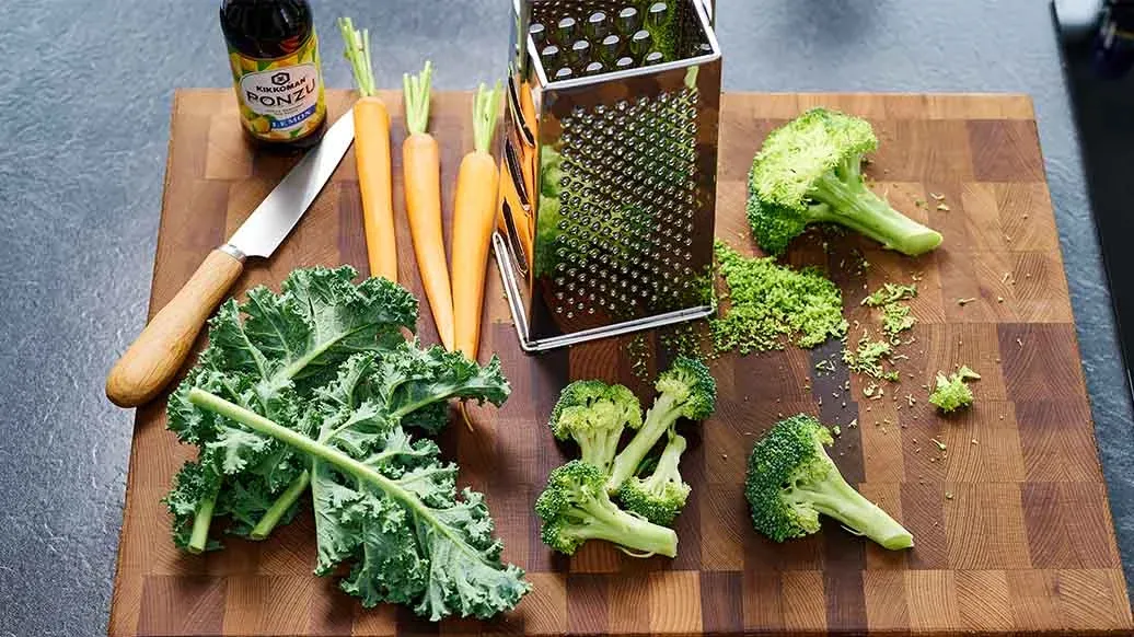Strimla grönkålen och riv broccolin och morötterna mycket fint.