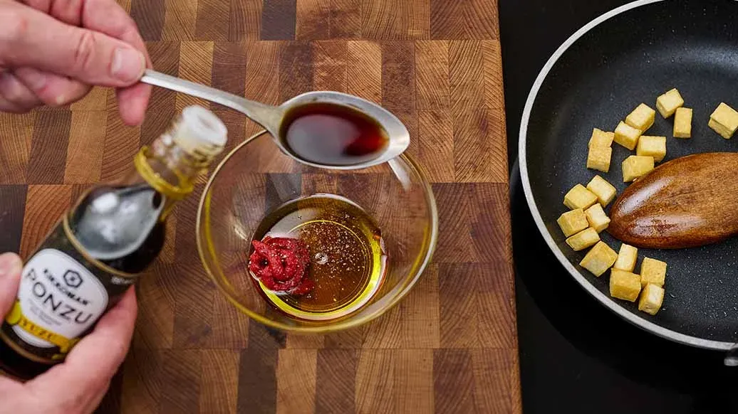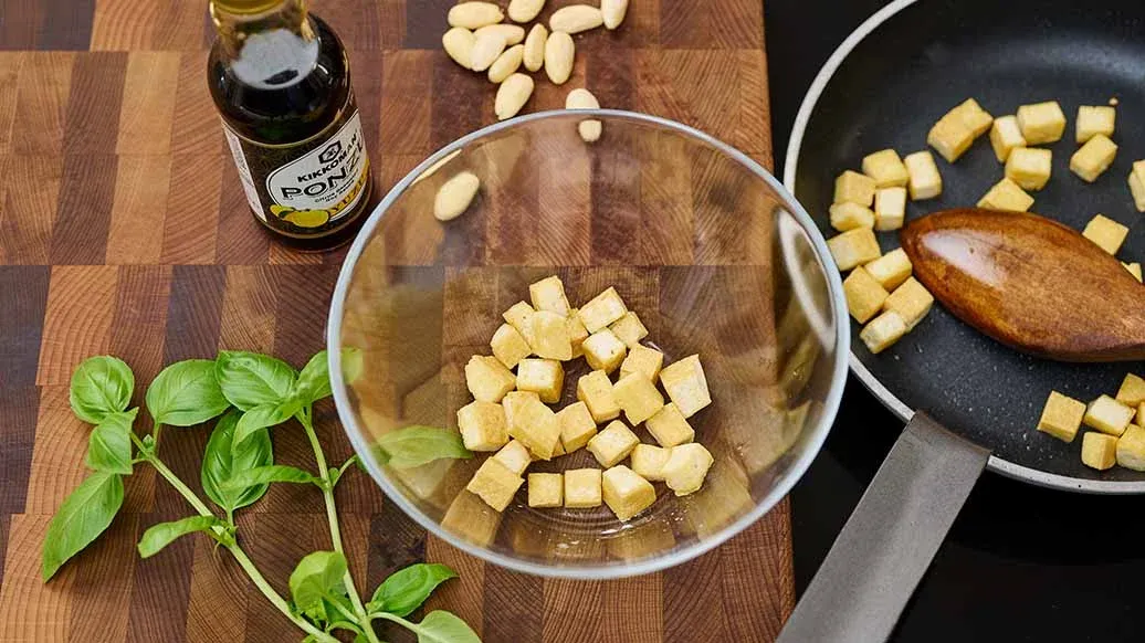 30 ml vegetabilisk olja – 90 g naturlig tofu, tärnad – 15 g färsk hackad basilika – 20 g skalad mandel – 30 ml Kikkoman Ponzu - en blandning av sojasås, ättika och yuzu-fruktjuice – ¼ tsk nymalen peppar