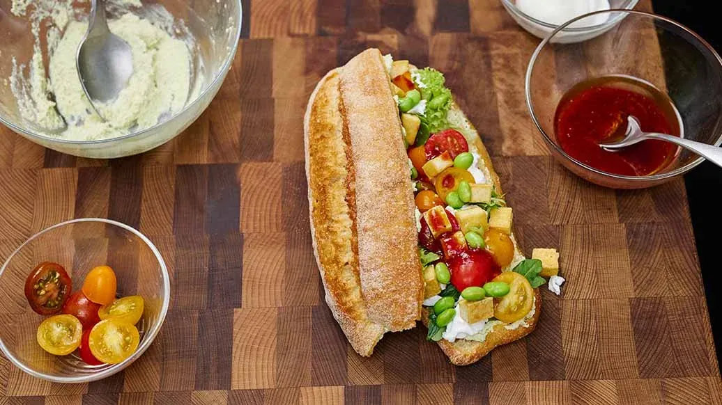 Skär ciabattalimpan på mitten horisontellt och fördela båda halvorna med tofupeston. På den nedre halvan, arrangera salladsbladen, följt av rivna bitar av burrata. Tillsätt körsbärstomaterna, tofutärningarna och edamamebönorna. Ringla över yuzu-vinägretten och lägg sedan den övre halvan av brödet över fyllningen. Skär på mitten på tvären och servera.