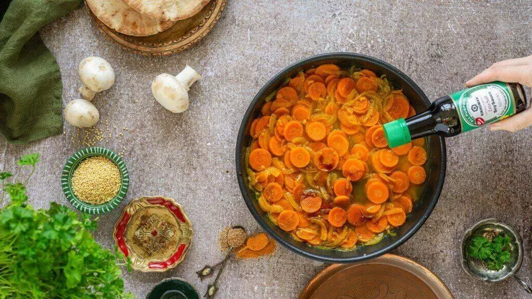 Skiva morötter och lök tunt, blanda dem med kryddorna och vitlöken, pressa genom en vitlökspress och fräs i olivolja. Häll i vattnet och låt sjuda på svag värme tills det är mjukt. Smaksätt med Kikkoman sojasås mindre salt och blanda till en slät sås.