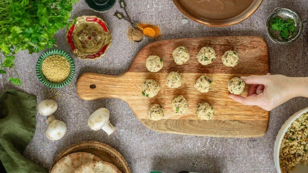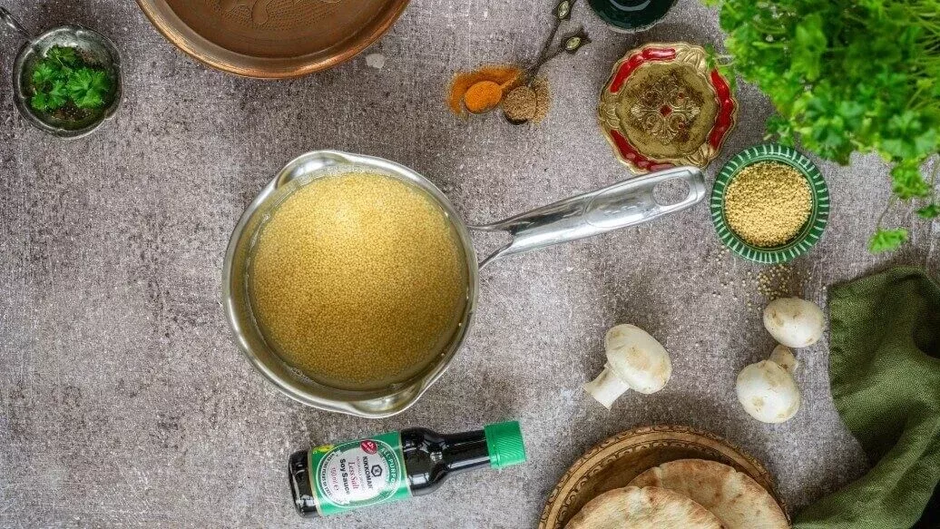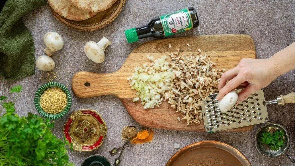 Tillsätt champinjonerna och löken till den kokta hirsen, följt av örter, peppar och Kikkoman sojasås mindre salt. Blanda allt och forma till små biffar och stek sedan i olja tills de är gyllenbruna. Servera med morotssås, hackad jalapenopeppar, persilja och couscous.