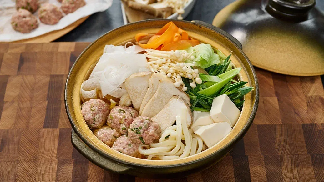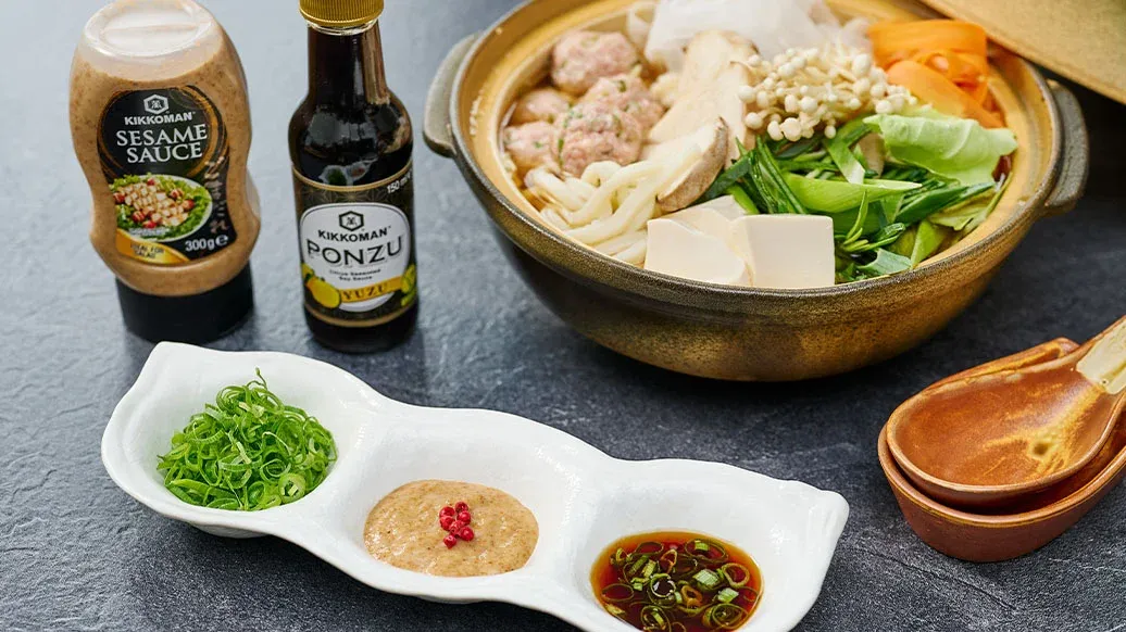 Denna rejäla buljong, som en gång serverades i sumostall för styrka och uthållighet, är fylld med tofuköttbullar, färska grönsaker och nudlar, kryddad med Kikkoman Ramensoppa och Kikkoman sesamolja, och serveras med dippsåser.