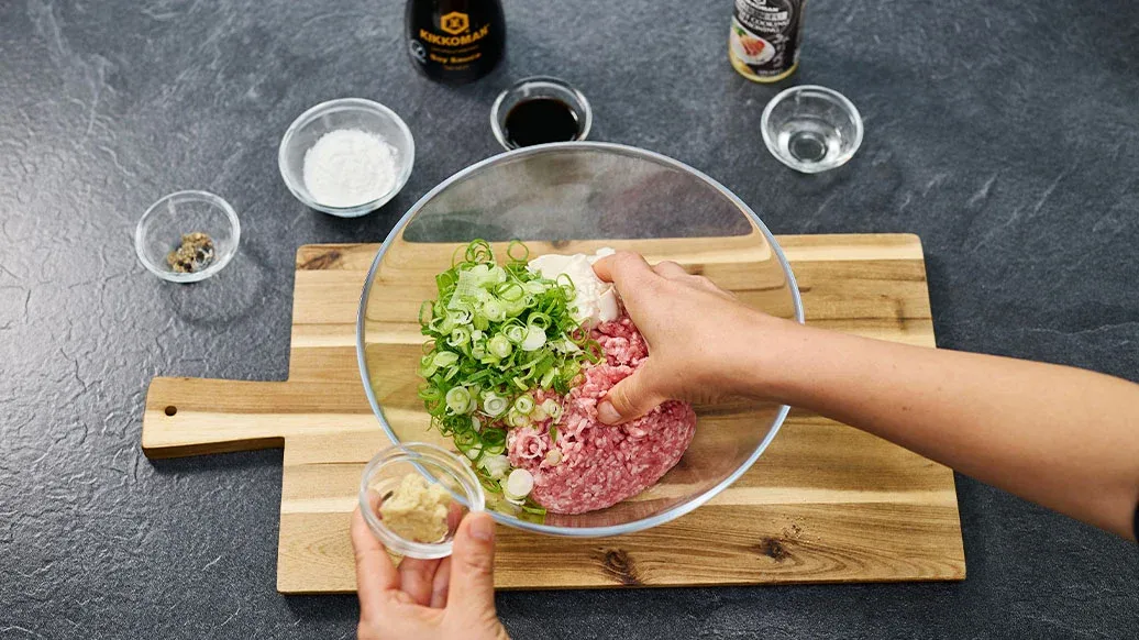 400 g köttfärs, valfri sort – 100 g tofu – 1 msk Kikkoman naturligt bryggd sojasås – 1 tsk Kikkoman söt Matlagningssås i Mirin-Stil – 2 tsk riven ingefära – 3 salladslökar, finhackade – 2 msk majsstärkelse – En nypa svartpeppar