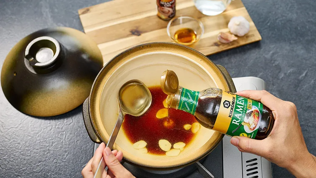 Tillsätt vatten, Kikkoman ramen nudelsoppa, Kikkoman sesamolja och skivad vitlök i grytan.