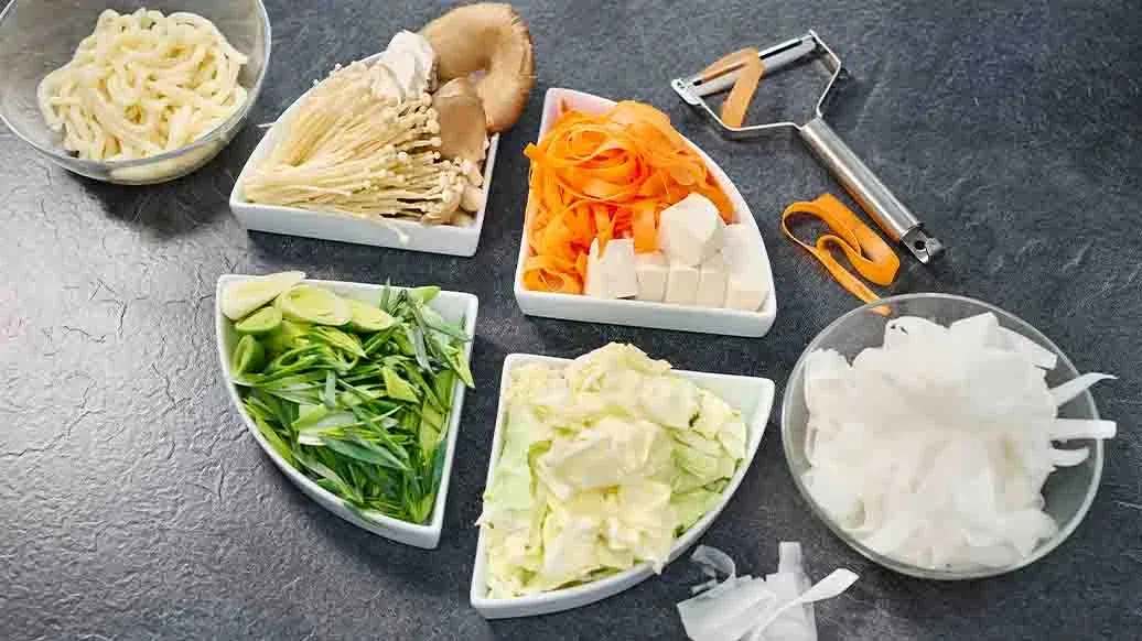 Skär kålen i munsbitsstora bitar. Skiva purjolöken diagonalt. Ta bort stjälkarna från svampen om det behövs och separera dem. Använd en skalare för att skära daikon och morot i tunna strimlor. Skär tofun i 8 bitar.