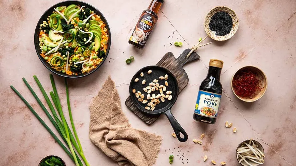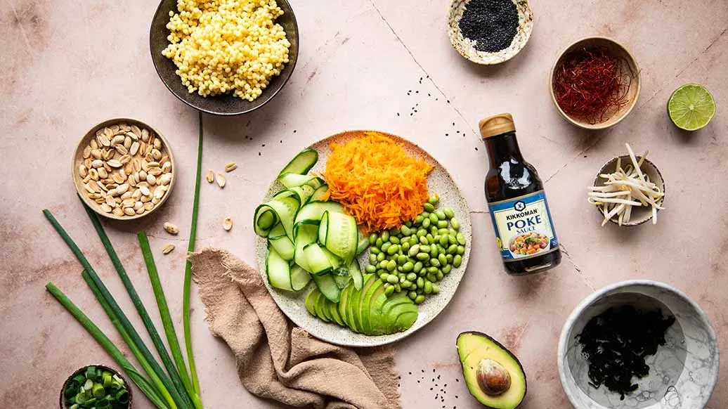 Saftiga grönsaker, krämig avokado, edamamebönor och delikata wakame-alger med couscous i en lätt honungs-limedressing gjord med Kikkoman Pokesås. Jordnötter, groddar och svart sesam ger en fyllig smak och extra krispighet till denna uppfriskande sallad.