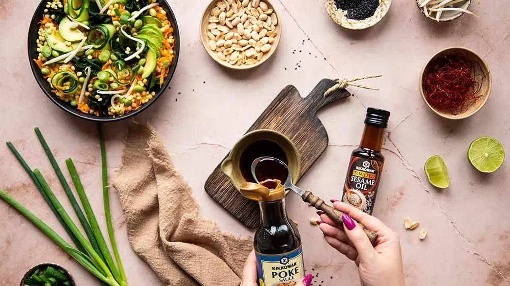 2 msk Kikkoman Sojasås- Och Sesamoljebaserad Sås Till Pokeskål – ½ msk limejuice – 1 msk Kikkoman rostad sesamolja – 1 tsk honung