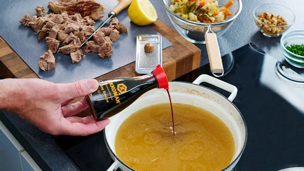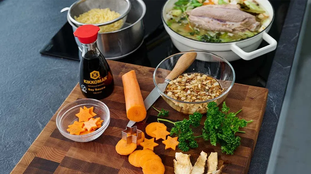 En festlig kalkonbuljong med morot, rotselleri och purjolök, berikad med Kikkoman sojasås och doftande kryddor. Serverad med nudlar och svamp, är denna tröstande soppa en värmande mittpunkt på vilket vinterbord som helst.