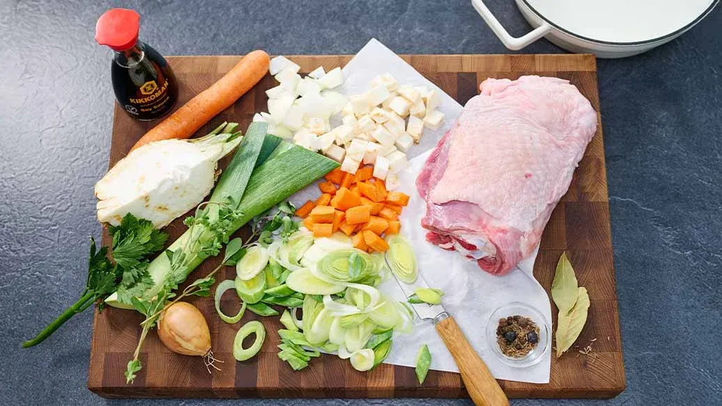 Tärna moroten, rotsellerin och löken. Skiva purjolöken i tunna ringar. Lägg grönsakerna och kalkonlåret i en stor kastrull med 1½ liter vatten och koka upp. Tillsätt lagerblad, enbär, pepparkorn, kryddpeppar, kummin, mejram och Kikkoman sojasås. Täck över och låt sjuda försiktigt i ca 1½ timme.