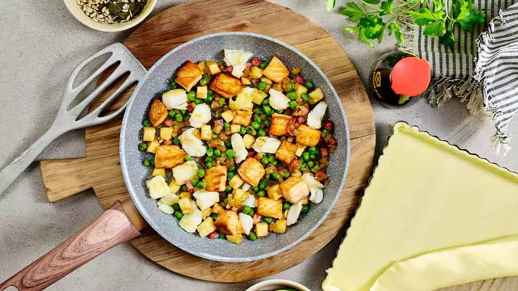 160 g pajdeg – 1 msk vegetabilisk olja – 100 g laxfilé – 100 g torskfilé – 30 g bacon – 1 lök – 50 g tinade ärtor – 50 g palsternacka