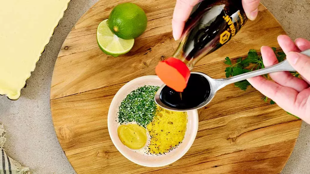 2 msk Kikkoman naturligt bryggd sojasås – 30 ml grädde – 1 msk senap – 1 tsk limejuice – ½ tsk nymalen peppar – ½ tsk currypulver – 2 msk färsk hackad persilja