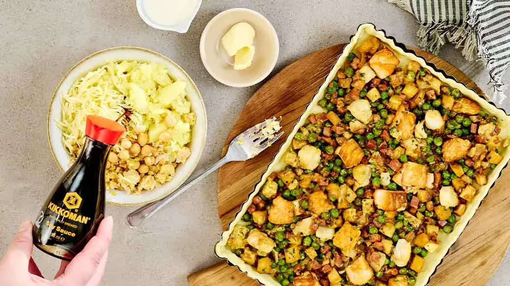 200 g förkokt potatis – 100 g konserverade kikärter – 20 g smör – 2 msk Kikkoman naturligt bryggd sojasås – 50 ml grädde – 70 g Gouda ost
