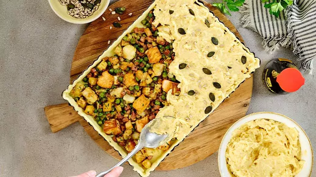 Dyk ner i denna underbara fiskpaj, där krämigt potatismos möter kryddad fisk, toppat med en knaprig fröskorpa.