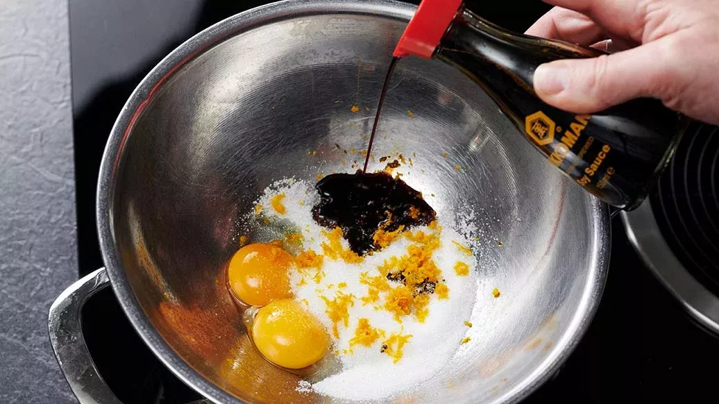 Vispa nu äggulorna tillsammans med sockret, skrapade vaniljstångsfrön, apelsinskal och Kikkoman sojasås över en bain-marie tills blandningen tjocknar något.