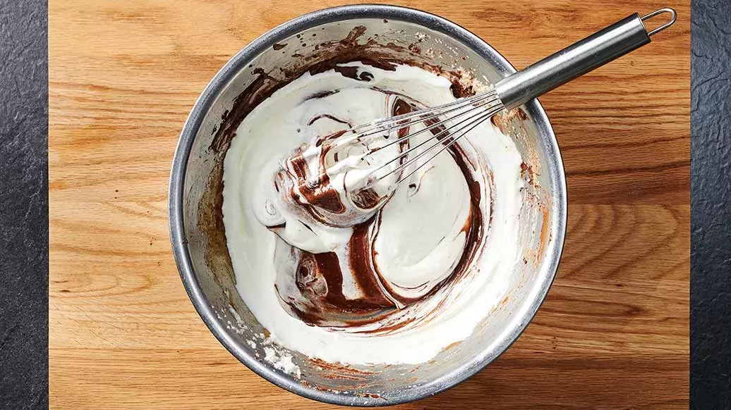 Ta bort blandningen från bain-marie och vänd snabbt ner den stela äggvitan, chokladen och grädden i ägguleblandningen, en i taget.