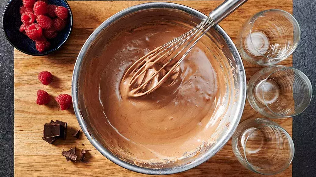 Före servering, lägg en klick vispgrädde på varje chokladmousse och garnera med hallon och mörka chokladchips.